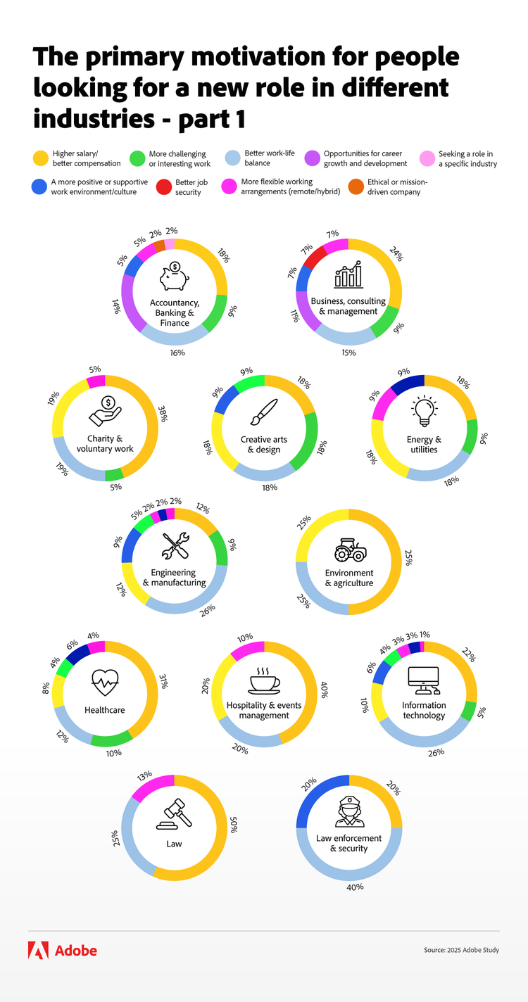 Just as motivations vary by location, they also differ from industry to industry. In Law and Environment and Agriculture, half of participants are chasing higher salaries, while in Leisure, Sport, and Tourism, more challenging work matters the most (31%).