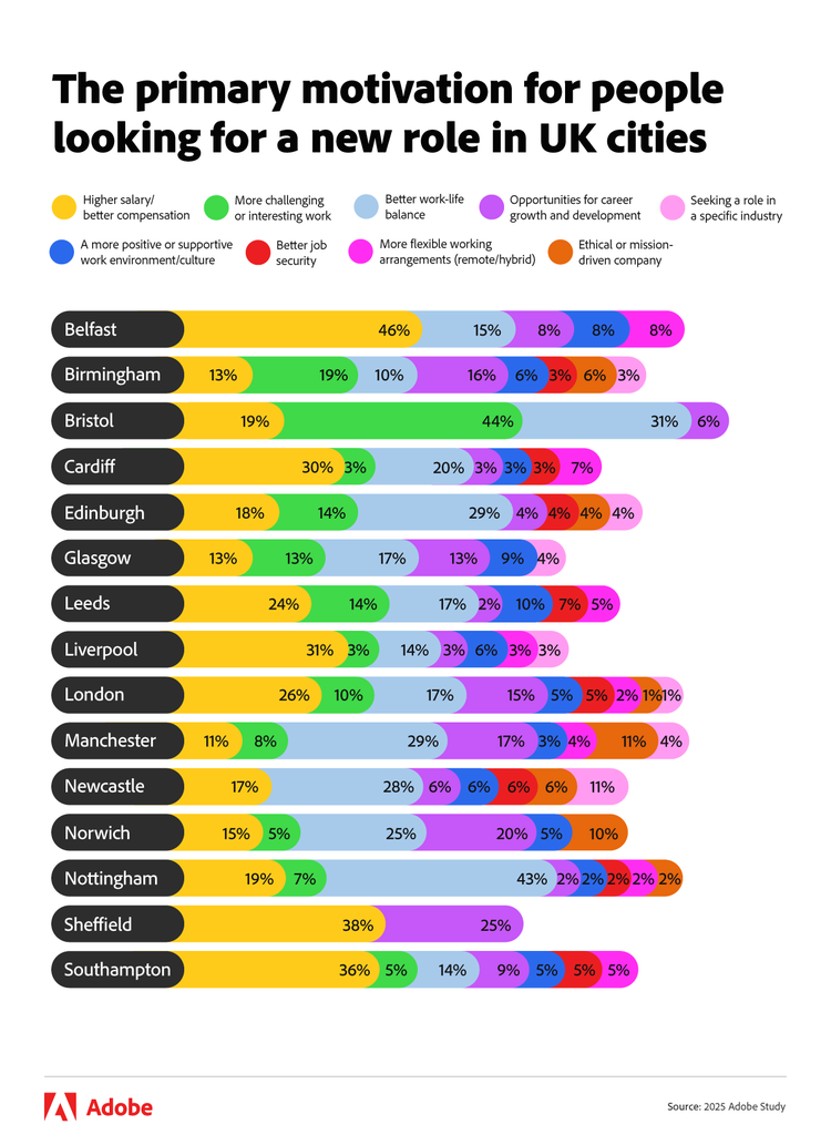 Nottingham stands out as a city where better work-life balance is a top concern (43%), whereas those in Sheffield seem particularly interested in career development (25%).
