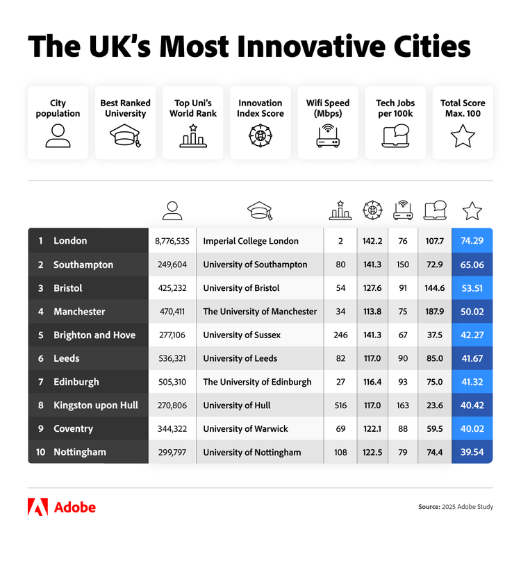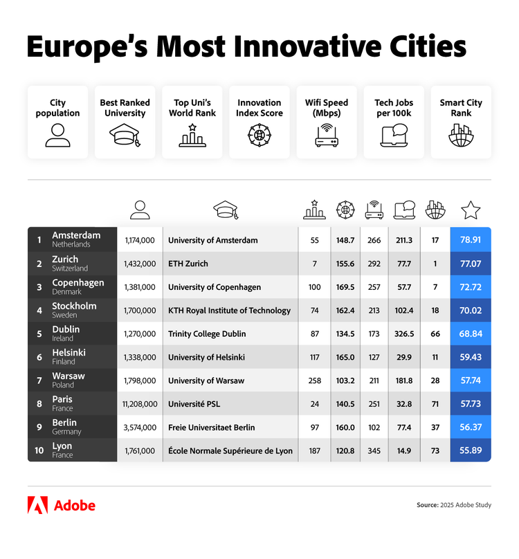 With this in mind, the team at Adobe Express set out to rank the most innovative cities across the UK and Europe. Analysing key factors including university rankings, Wi-Fi speeds, and tech jobs per 100,000 people, we’ve revealed the hotspots where innovation is thriving.