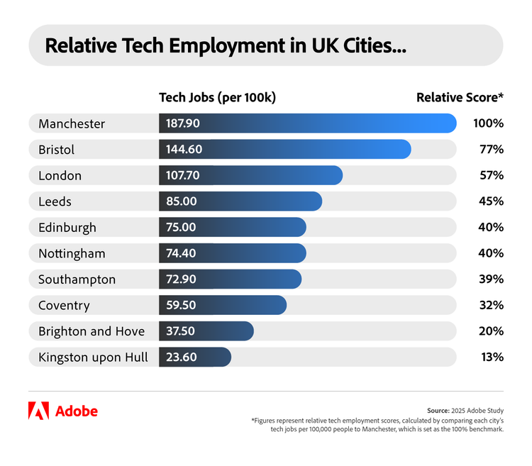 With the highest percentage of tech jobs in our ranking (187.9 per 100,000) Manchester steals the fourth spot.