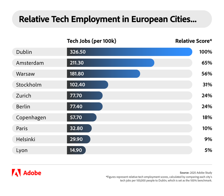 Dublin wraps up our list with the highest concentration of tech jobs: 326.5 per 100,000. Trinity College Dublin is also ranked 87th worldwide, and it’s a strong contributor to the city’s talent pool and innovation landscape.