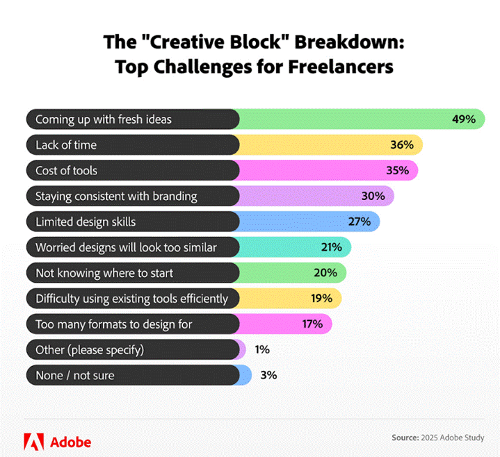 But creating these assets doesn’t come without challenges, and nearly half of freelancers say that brainstorming fresh ideas is a constant hurdle. 36% also cite a lack of time, while 35% point to the cost of design tools as a barrier to their creativity.