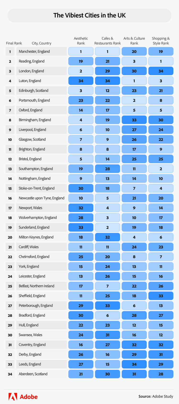 Adobe Express used the number of Instagram posts and Yelp data per 100,000 residents to rank the "vibiest" cities in the UK, places where culture, creativity, and community energy come together. The ranking included 34 cities and was based on these four main categories: