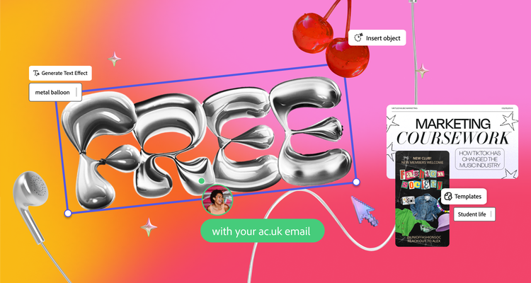 Sign in to Adobe Express using your .ac.uk address and you'll automatically get at least 6-months free Premium access - no need for credit card details or to cancel afterwards. Enjoy all the Premium features, including more quality templates, fonts, and Generative AI credits.