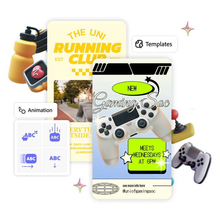 Whether you're making a last minute poster for a uni project or an insta story for run club, Adobe Express has thousands of templates, built by pro designers so you don't have to be one. From one page reports to detailed presentations, we've got you.