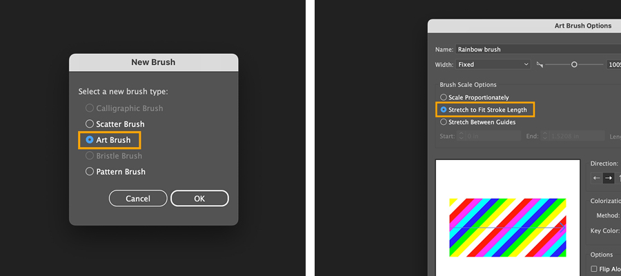 In the New Brush window, choose Art Brush and click OK. Then name the brush, choose Stretch to Fit Stroke Length and click OK.