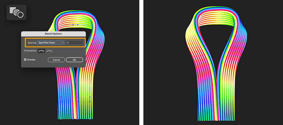 With both paths selected, choose Object > Blend > Make. Then double-click the Blend tool to set the Blend Options to match the settings shown in the image to create a ribbon-like design.