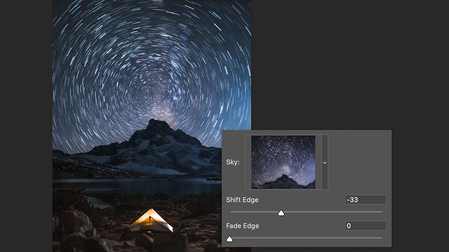 An action includes a series of changes that can be made to an image with the click of a button. With the pasted sky layer selected, open the Actions panel (Window > Actions) and click the flyout menu. Choose the Star Trails Rotation action from the Stars Trails folder and click Play. Then save the file to your device as a JPEG.