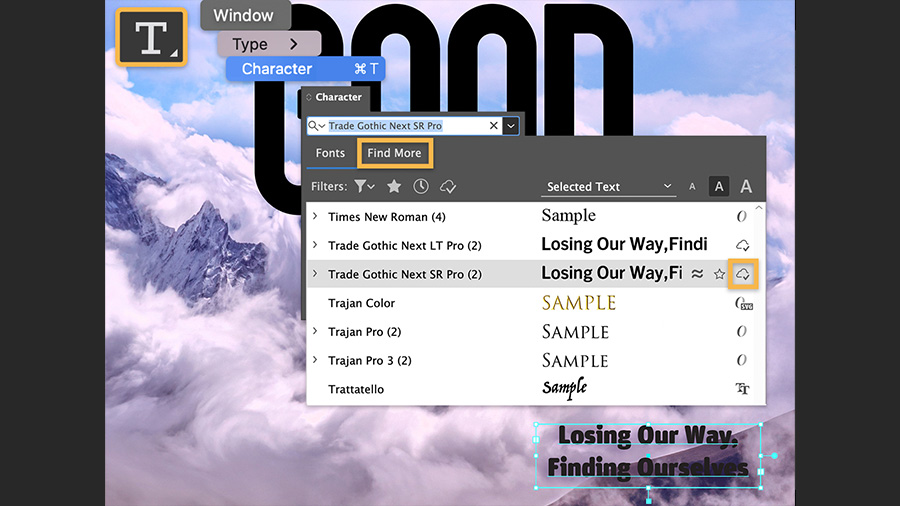 Drag to select the subhead placeholder text with the Type tool. Then click the dropdown in the Character panel (Window > Type > Character) and select Find More to access Adobe Fonts. Mouse over different fonts for a preview.