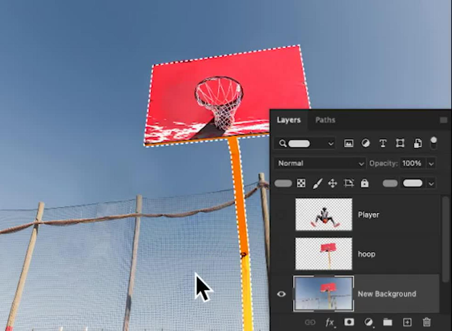 From the Paths panel, make a selection from the hoop path and select the new background layer. Use Content-Aware Fill to remove the hoop, leaving the fence and sky.