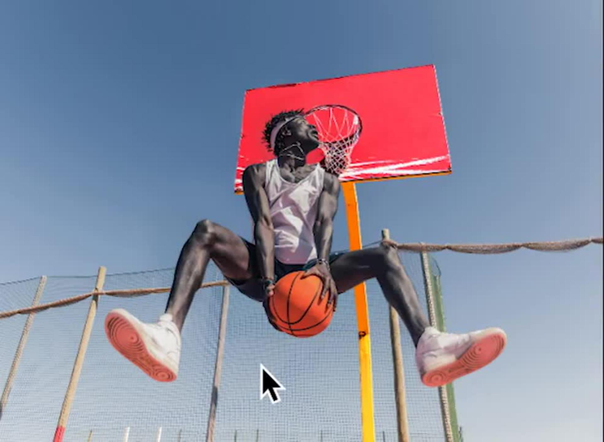 In Photoshop, duplicate the Background layer and hide the original layer. With the Pen tool, create a path around the athlete and name the path in the Paths panel (Window > Paths). Press the Escape key twice on your keyboard to exit the current path. Then create a new path around the hoop and name it.