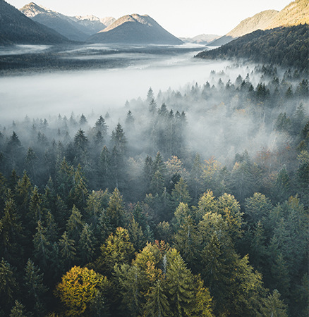 Serene nature landscape photograph of a foggy forest valley captured from above.